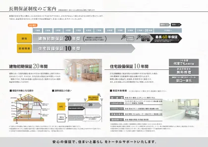 建物の柱や梁、土台、基礎、床など、住まいの基本構造部分や、雨水の侵入を防ぐ部分に関して、法律で定められている10年保証を超え、20年間の初期保証を実施しています。